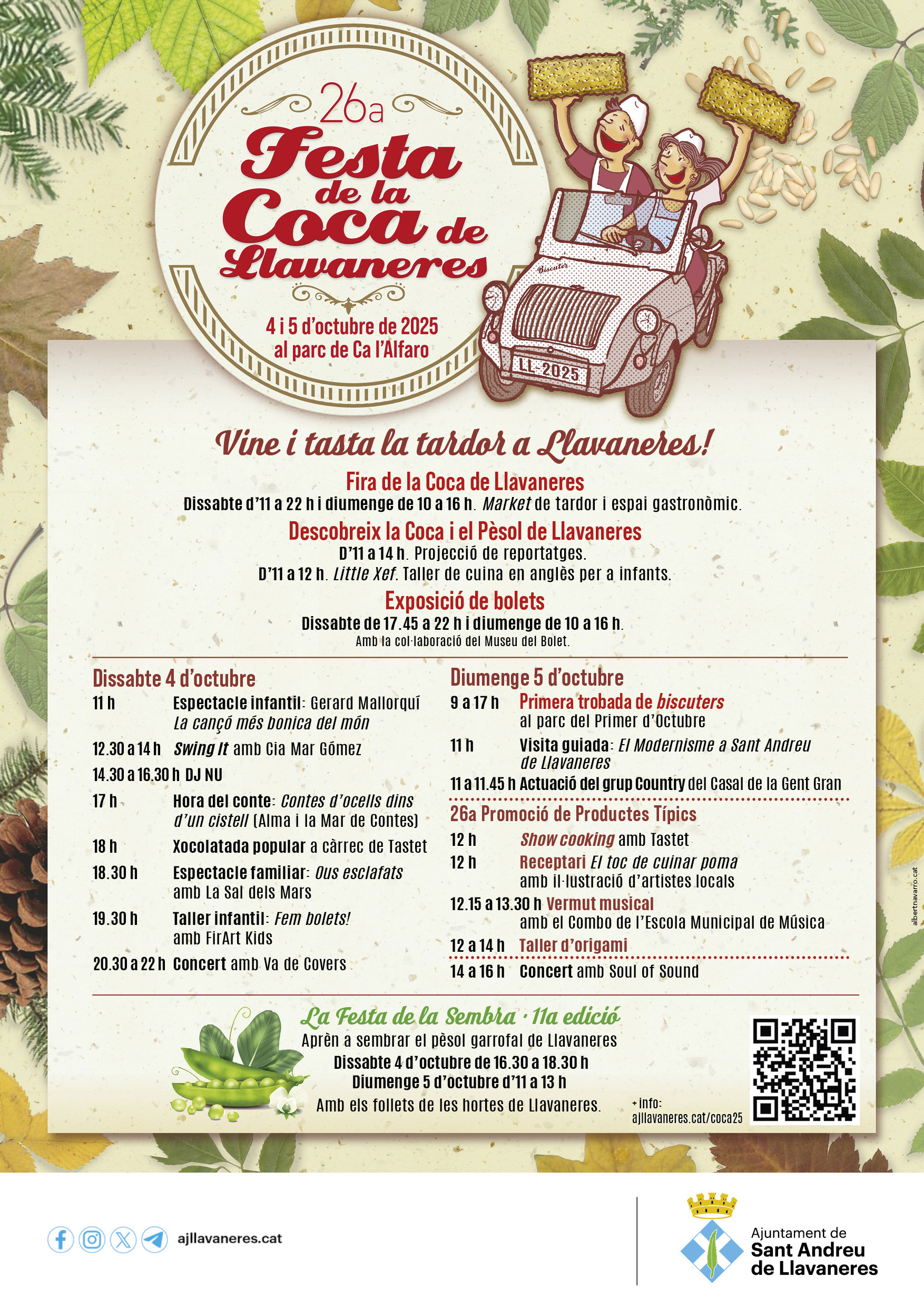 Dissabte 4 d'octubre. Tota una jornada per visitar la fira dedicada a la Coca de Llavaneres, d'11 a 22 hores. Serà un espai obert on durant tot el dia els visitants podran degustar i comprar aquest producte. A més, hi haurà tallers i activitats per a tota la família, espai gastronòmic, música en directe i la tradicional exposició de bolets.