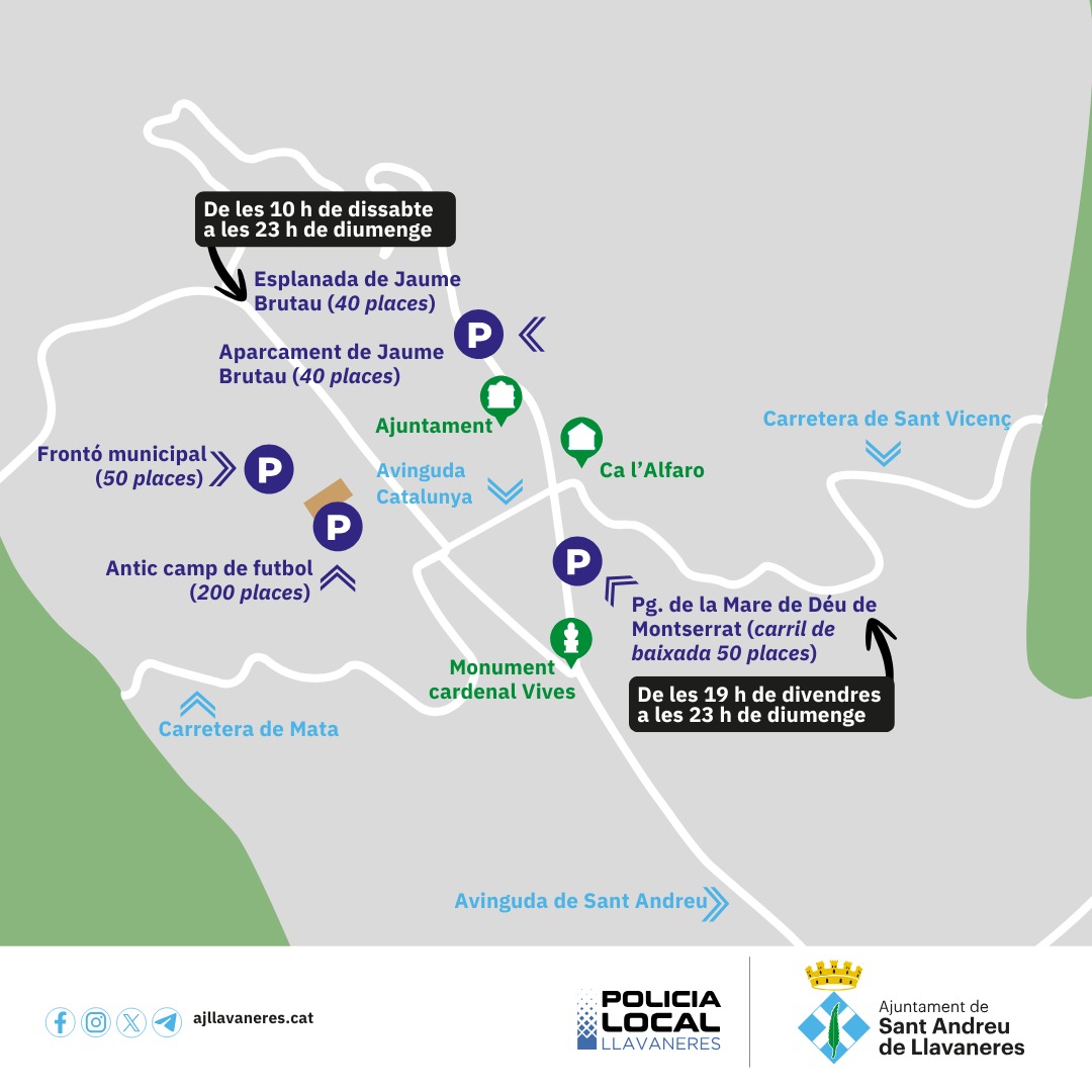 AVÍS | A més dels aparcaments de l'antic camp de futbol, del frontó municipal i del passeig de Jaume Brutau, habilitem el lateral del passeig de Mare de Déu de Montserrat (carril de baixada). Per a més informació, consulteu aquest plànol.