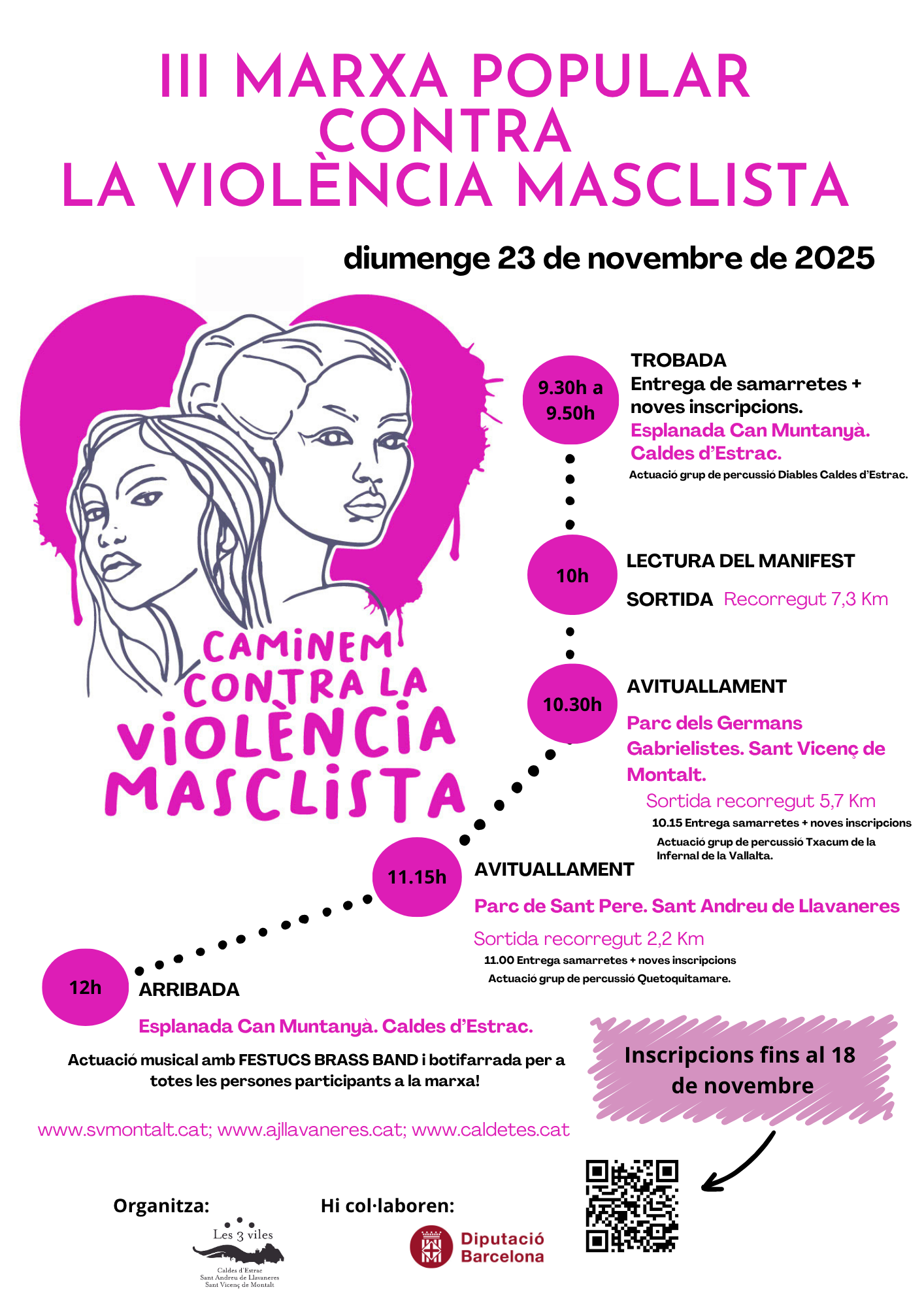 Sortida a les 10 h des de l'esplanada de Can Muntanyà, a Caldes d'Estrac. El recorregut, de 7,3 km, unirà Caldes d'Estrac, Sant Vicenç de Montalt i Sant Andreu de Llavaneres en una caminada conjunta per mostrar el rebuig a les violències masclistes.