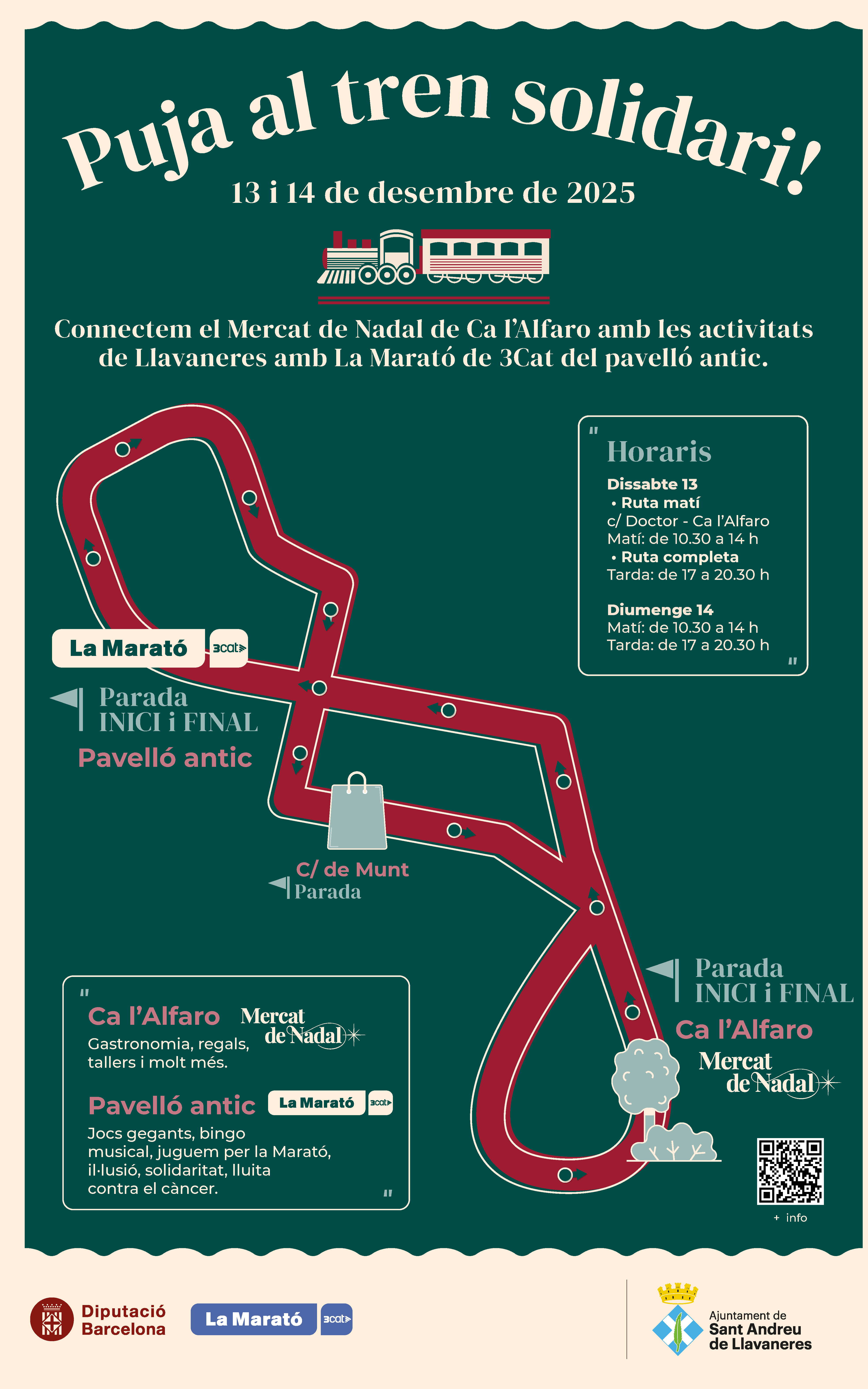 Llavaneres es prepara per a un cap de setmana intens amb activitats nadalenques i solidàries. De divendres 12 a diumenge 14 de desembre, es podrà visitar el Mercat de Nadal al parc de Ca l’Alfaro. A més, dissabte a la tarda i diumenge durant tot el dia, el pavelló antic serà el centre de les activitats de Llavaneres amb La Marató de 3Cat. Per facilitar els desplaçaments, tant dissabte com diumenge s'habilitarà un trenet que connectarà el parc de Ca l’Alfaro amb el carrer dels Contrabandistes. A més, dissabte al matí es podrà fer la visita guiada 'El Modernisme a Llavaneres' o bé participar del tradicional taller de postals de Nadal a la Biblioteca Font i Daniel.