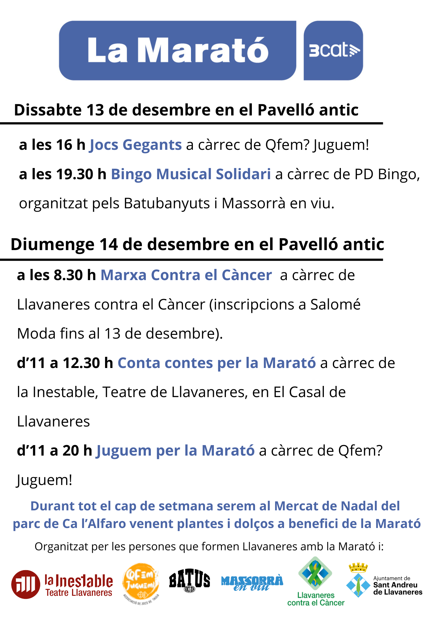 Les activitats solidàries de Llavaneres amb La Marató de 3Cat començaran dissabte 13 a la tarda i s’allargaran fins diumenge 14 al vespre, al pavelló antic del carrer dels Contrabandistes. Dissabte a la tarda hi haurà jocs gegants, mercat solidari de jocs de taula i bingo musical solidari. Diumenge serà el torn de la 4a edició de Juguem per La Marató, a més de la Marxa Contra el Càncer i la Gimcana de contes a El Casal de Llavaneres. Al Mercat de Nadal de Ca l’Alfaro també hi haurà una parada solidària de plantes i dolços nadalencs.