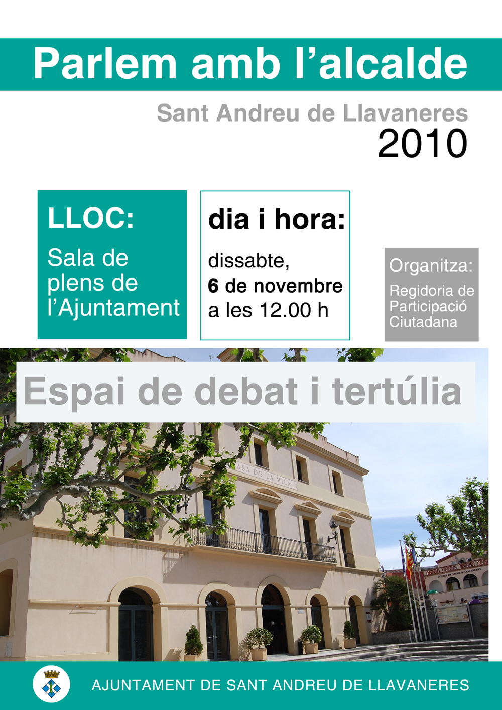 La Regidoria de Participació Ciutadana convida a assistir aquest dissabte a la darrera edició de Parlem amb l'alcalde. Es tracta d'un nou espai de diŕleg obert als ciutadans, que es va posar en marxa el 6 de març en compliment del compromís que el consistori va adquirir amb els participants del procés de participació Quin Llavaneres Volem. L'espai ha de servir per fer arribar directament queixes, reivindicacions i suggeriments.